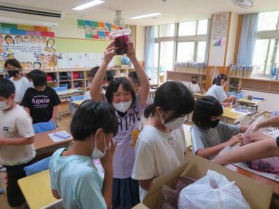 持ち帰る前、少しだけ味見をしました。おいしい「カリカリ梅」を何度も味見する子もいました。爽やかな甘さが最高でした。