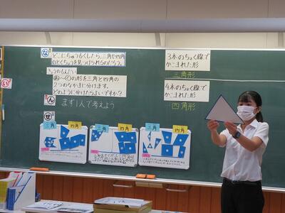 今日の2時間目、2年生の算数の研究授業が行われました。授業には、教育事務所や教育委員会の先生方も見に来られました。今日の授業は、三角形と四角形の意味や性質を知る学習でした。いろいろな三角形と四角形を分類しながら、意味や性質を理解する授業で、「辺・頂点・三角形・四角形」という算数の用語も覚えました。一人で考えたり、グループで考えたりと、いろいろな考えを広げていく工夫もあり、協力して楽しく学ぶ姿も印象的でした。