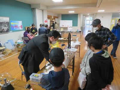 体育館入り口では体験教室も行われました。私もその中で科学実験コーナー「ファラデー塾」のお手伝いを、前校長の山下先生と一緒にしました。