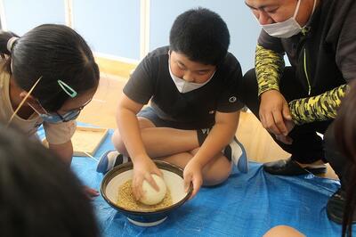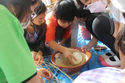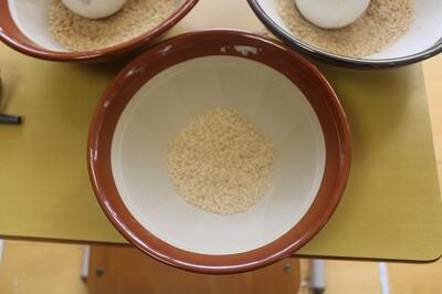 2日木曜日、3年生は稲刈りしたバケツ稲の脱穀と籾すりを行いました。今回もJA青壮年部の方々に指導していただきました。その時の様子です。