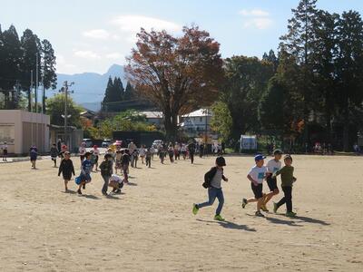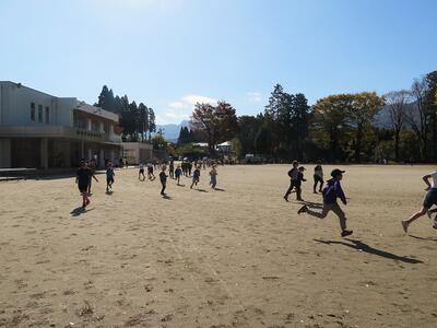 今朝は昨日の雨の影響か、かなり冷え込みを感じました。それでも3時間目ごろから天気になり外で元気に体育をする学年もありました。体育の様子です。2年生は持久走大会に向けての練習、5年生はハードル走でした。