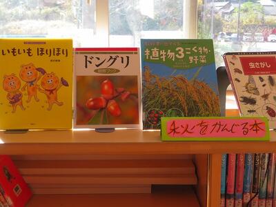 今、図書室には「秋を感じる本」のコーナーが設置してあります。その中に「いもいもほりほり」という絵本があり、芋掘りのことをホームページにアップしたばかりでしたので、思わず手に取り読んでみました。なかなかおもしろい絵本です。