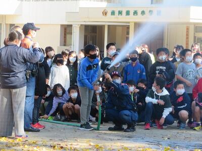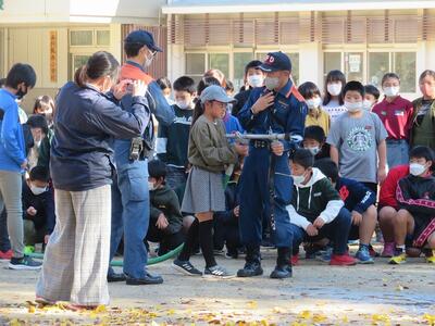 最後は、消防車を見せてもらいました。1年生や3年生は国語や社会の学習にも関係があって大喜びでした。もちろん他の学年も興味深く消防車に集まっていました。