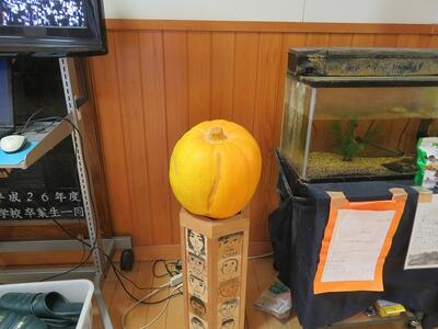 先週から1年生の教室と職員玄関に大きなカボチャが飾られています。みんな見たり触ったりしてびっくりしています。