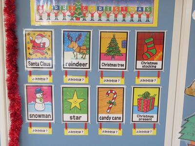 多目的ホールは英語、クリスマスにちなんだ掲示です。クイズもります。
