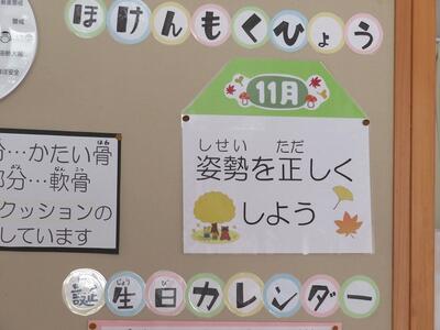 新しい掲示物を紹介します。児童昇降口です。保健室の掲示物は「正しい姿勢」を意識させる掲示物です。