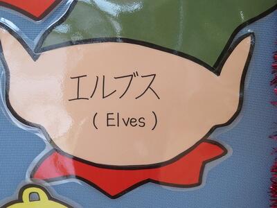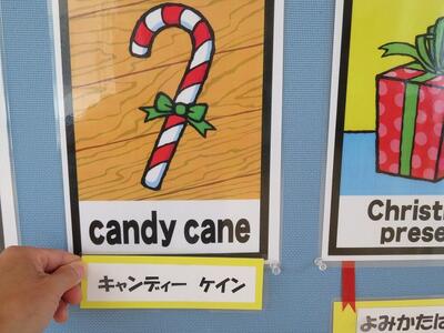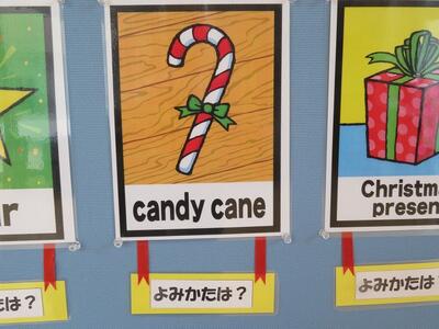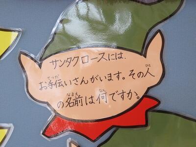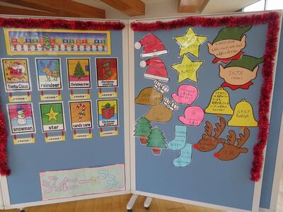 多目的ホールは英語、クリスマスにちなんだ掲示です。クイズもります。