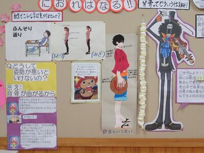 新しい掲示物を紹介します。児童昇降口です。保健室の掲示物は「正しい姿勢」を意識させる掲示物です。