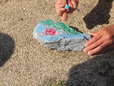 1時間目、5年生が石に絵や文字などを楽しそうに描いていました。