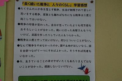 いよいよ6年生は明後日14日から修学旅行です。6年になり、4月後半から修学旅行に向けた取組が行われています。教室にはそのプランも掲示してあり、子どもたちが見通しが持てるようにしてありました。また、平和学習の感想も掲示してあり、準備が整ってきていることが、よく分かります。
