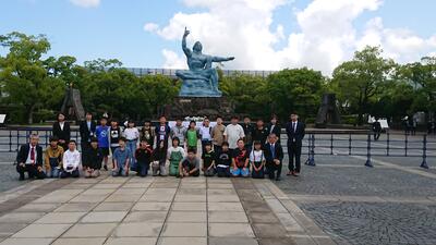 被爆体験講話、昼食、平和学習の様子です。平和祈念像前でのセレモニー、被爆体験講話、永井隆記念館での講話、3つの班に分かれてのフィールドワーク、原爆資料館見学と、今日の学習が終わりました。これから平戸のホテルに向かいます。