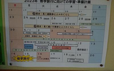 いよいよ6年生は明後日14日から修学旅行です。6年になり、4月後半から修学旅行に向けた取組が行われています。教室にはそのプランも掲示してあり、子どもたちが見通しが持てるようにしてありました。また、平和学習の感想も掲示してあり、準備が整ってきていることが、よく分かります。