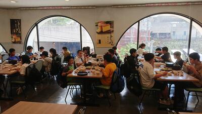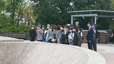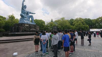 被爆体験講話、昼食、平和学習の様子です。平和祈念像前でのセレモニー、被爆体験講話、永井隆記念館での講話、3つの班に分かれてのフィールドワーク、原爆資料館見学と、今日の学習が終わりました。これから平戸のホテルに向かいます。