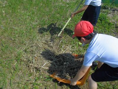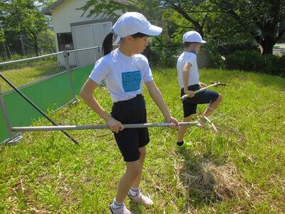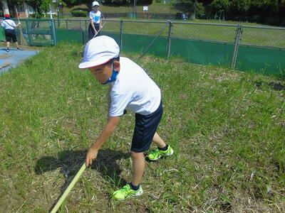 5時間目、暑い中、4年生がプール掃除を頑張りました。4年生はプール周りの刈り取られた草を集めたり、溝さらいをしたりしました。