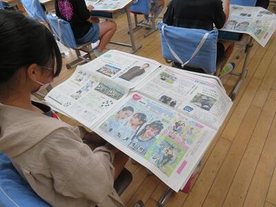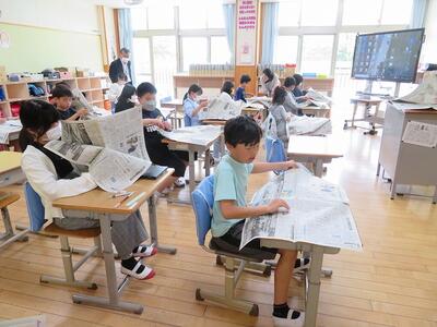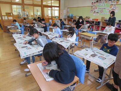 5年生は、国語や社会、総合等で新聞記事を活用することがあります。その事前授業として、熊日新聞の記者さんから新聞の読み方を教えていただきました。途中からは、子ども用に作られた記事をタブレットで読んでみました。ネット上にはいろいろな情報がたくさんある中、正しい情報を取捨選択する力は大事です。タブレットで新聞を読みながら、新聞が公共性の高い資料ということが子どもたちにも分かったようでした。
