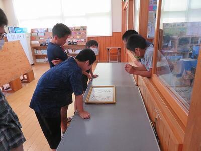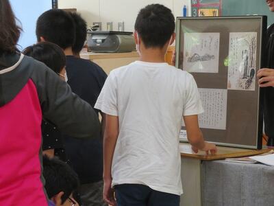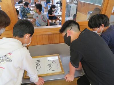 2時間目、6年生では修学旅行後の平和学習が行われ、南阿蘇中に寄贈された永井隆博士直筆の絵や書を見ました。
