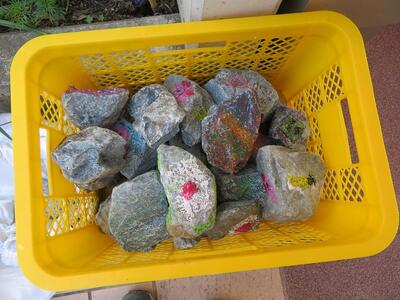 この活動は立野ダム工事事務所から依頼された活動で、描いた石がメモリアルストーンとしてになるそうです。描いた石がメモリアルストーンとして埋納され、ダムの一部になると思うとワクワクしますね。