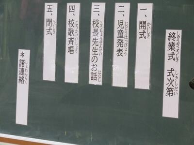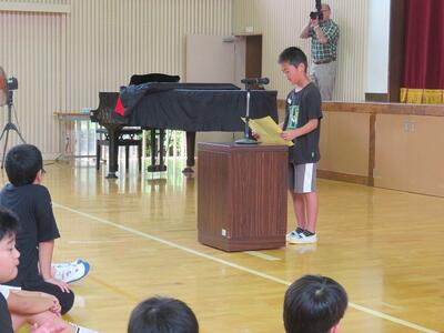 終業式では、2年生の代表2人が、一学期の振り返りと二学期のめあてを発表しました。全校児童の前での発表は、初めてでしたが、2人とも落ち着いて、とても上手でした。