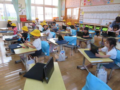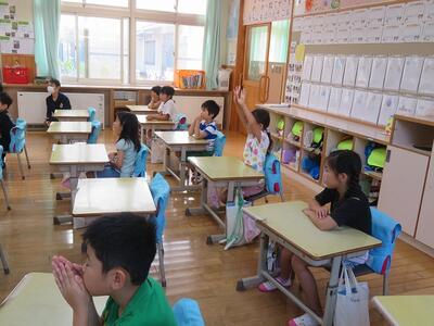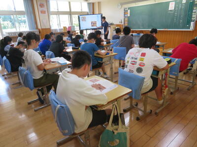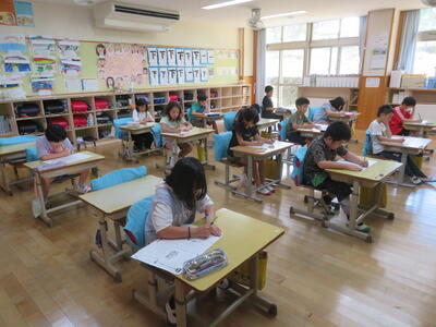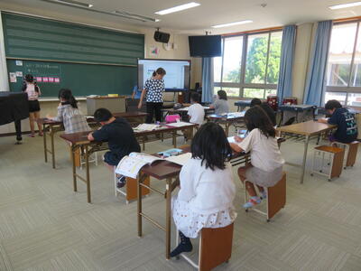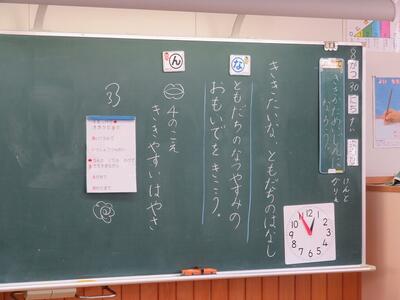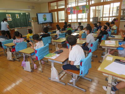 1年生は、国語、なつやすみの思い出を発表していました。実物投影機を使って電子黒板に映した絵を見せながら発表していました。
