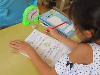 デジタルに慣れた子どもたちには、難しい勉強です。アナログ模型時計を操作しながら問題を解いていました。