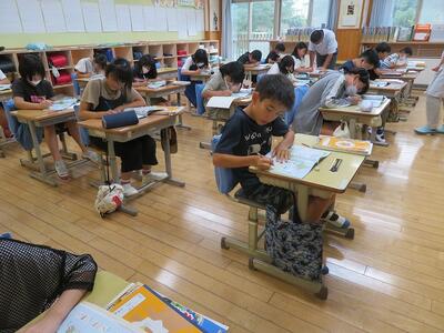 朝から雨でしたが、子どもたちは落ち着いて学習していました。2時間目の4・5・6年生の様子です。4年生は算数、少人数の授業、わり算の勉強でした。どちらのクラスも集中していました。