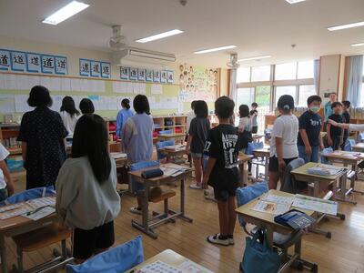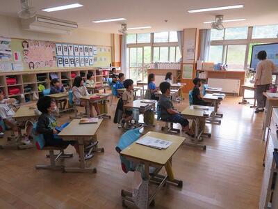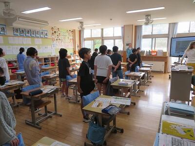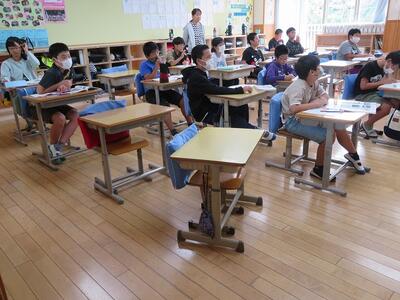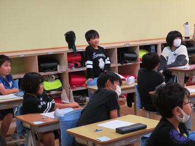 同じく昨日の5時間目、4年生の総合でも、ゲストティーチャーから学びました。「6.26白川大水害」について、南阿蘇村に住んでおられた田上さん(みゆさんのおじいちゃん)から当時の様子を聞き取りしました。この日のため、現在お住まいの熊本市から来ていただきました。