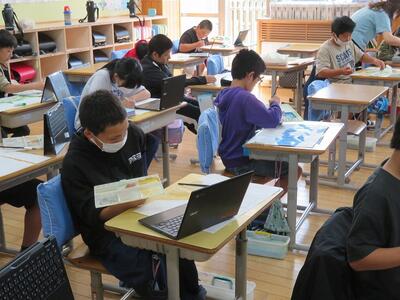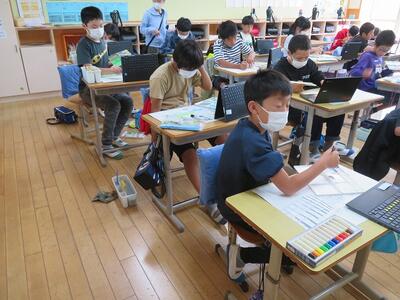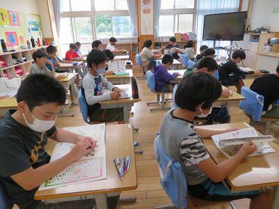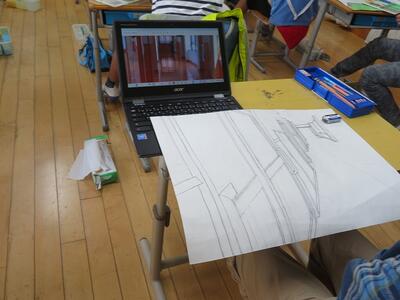3時間目、6年生の図工は風景画。タブレットで撮った写真を見ながら描いていました。撮った写真は、構図が工夫されていました。遠近感や奥行きが分かるような絵を描いていました。