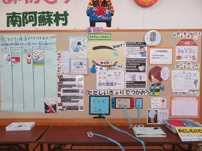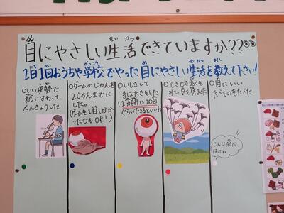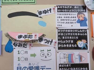 保健の掲示物は、10月10日の目の愛護デーにちなんだ掲示がしてあります。