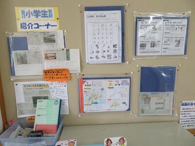 子ども新聞を自学に活かせるようスクラップした記事も置いてあります。自由に持ち帰り使っていいようにしてあります。
