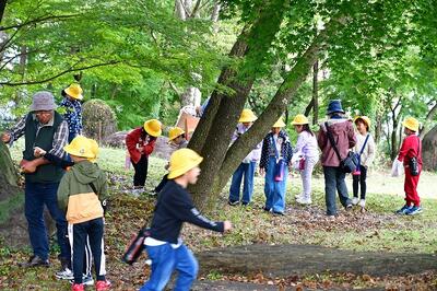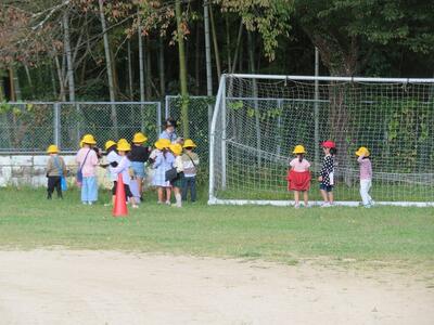 1時間目、1年生が生活科で秋を探しに運動場で活動していました。