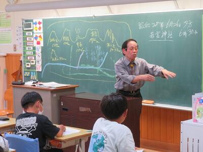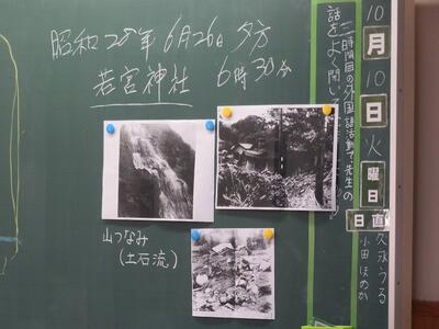 黒板に絵を描いたり、当時の新聞記事のコピーを見せたりしながら分かりやすく被害の様子、山津波(土石流)のことなどを話して下さいました。