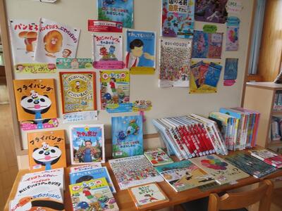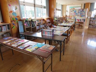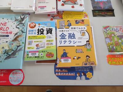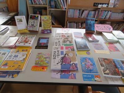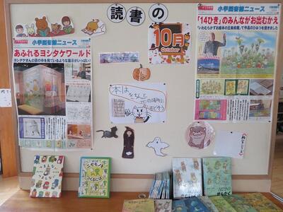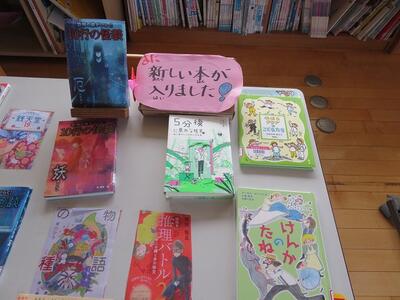 先日、保健室前や理科室前の掲示物を紹介しましたが、今日は、図書室と英語の掲示物を紹介します。図書室の掲示です。新しい本がたくさん入っています。