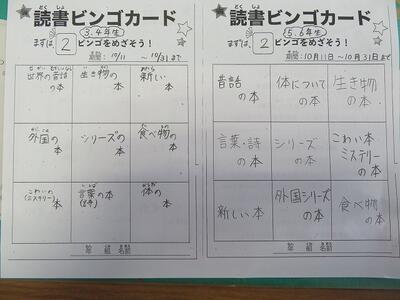 読書の秋ということで図書委員さんが「読書ビンゴ」を考えてくれました。いろんなジャンルの本に親しむための取組です。