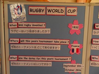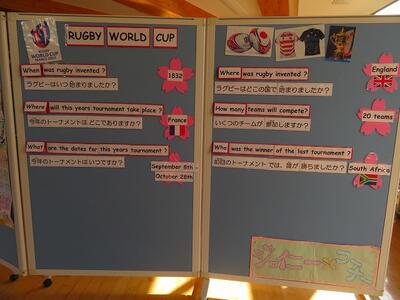 読書の秋、たくさんの本を呼んで欲しいです。多目的室の英語コーナーは、ワールドカップにちなんだものでした。