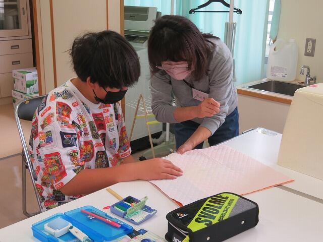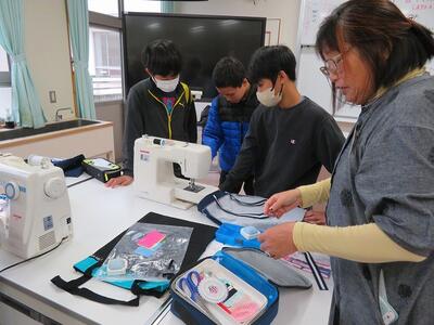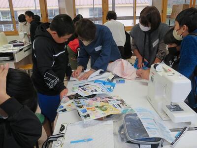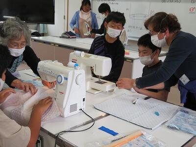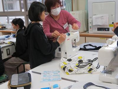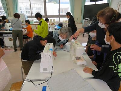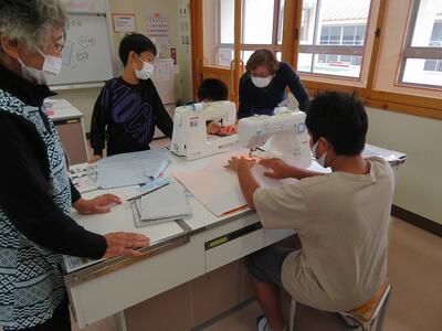 各グループに一人から二人入っていただきました。6年生は、昨年もミシンを使った学習の時、学習サポーターの皆さんに来ていただいていました。