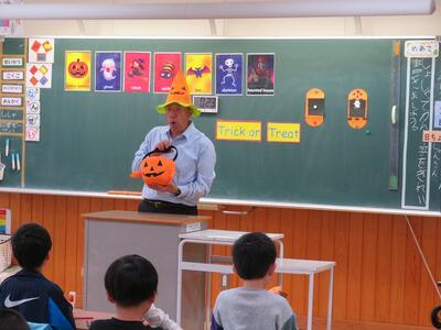 2年生の外国語活動では、異文化理解ということで、ハロウィンのことを知る活動が行われていました。