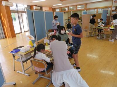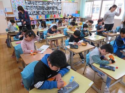科学展発明工夫展に出品した子どもたちは、運動会期間中も理科専科の北先生と一緒に、朝の時間や昼休み、また、家に持ち帰ってお家の方の協力を得ながら作品を仕上げました。