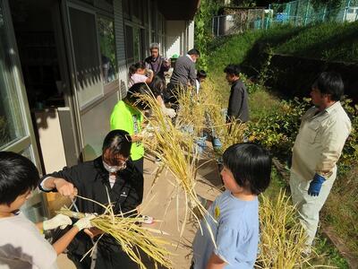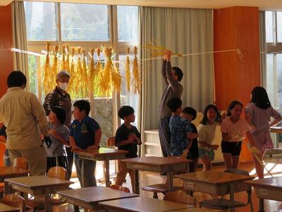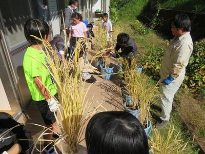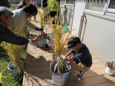 そんな中、3年生のバケツ稲は稲刈りを迎えました。JA青壮年部の方にお手伝いいただき、稲刈りと掛け干しをしました。