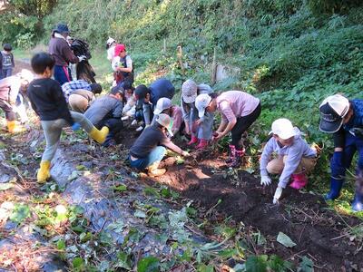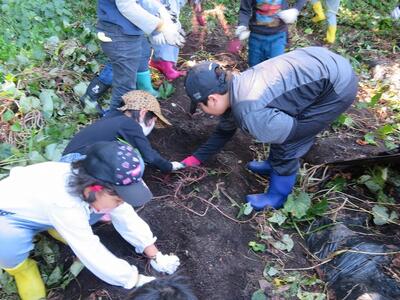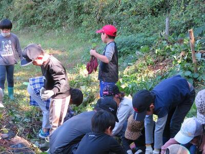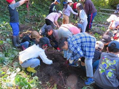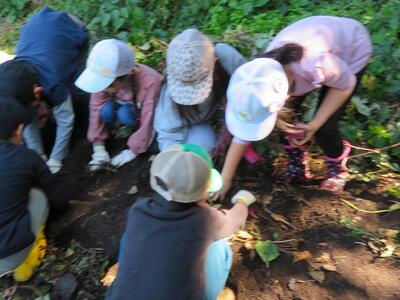 3時間目、2年生がサツマイモの収穫をしました。サツマイモのツルを先生方にとってもらった後、子どもたちは茎のまわりの土を掘って芋を見つけていました。
