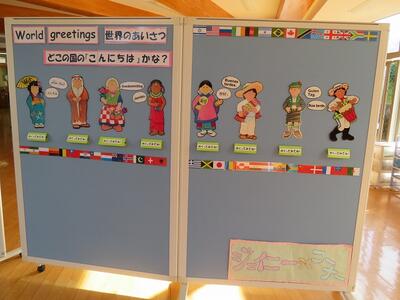 多目的室の英語の掲示は、世界のあいさつがテーマです。