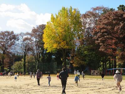 業間、ランランタイム、きれいに黄色に色づいたイチョウ、日光があたると金色にも見えます。子どもたちはイチョウをバックに元気に走っています。
