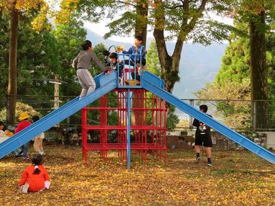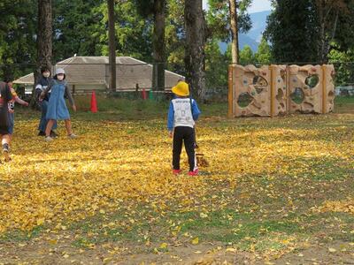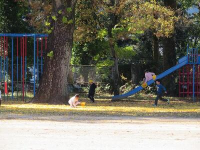 昼休み、今日も外では落ち葉で遊ぶ子どもたち、1年生だけでなく他の学年も楽しんでいました。