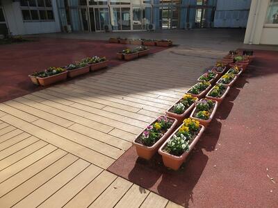 花一杯運動で植えたパンジーとビオラがしっかり根付いてきて、きれいな花を咲かせています。