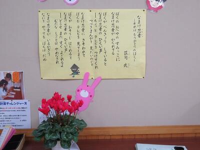学習コーナーです。詩が変わりました。一緒に置かれたシクラメンもきれいです。