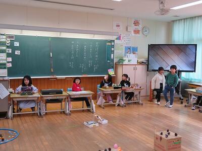 4時間目、1年生の学活は「がんばったね会」が行われました。先週、長陽保育園の年長さんと交流をしたことを紹介しました。交流では、年長さんを楽しませようと一生懸命頑張った1年生、今日は、自分たちが楽しむ番です。2つの班に分かれてお互いに楽しみました。いろいろな遊びの場をスタンプラリー形式で楽しみました。私も参加させてもらいました。どの遊びの場も、工夫があって本当に楽しかったです。