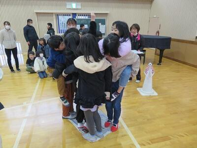 縦割り班10班で競い合うゲームです。ゲームのネーミングの通り、じゃんけんで負けたあとの協力(団結)がポイントです。じゃんけんで負けると、新聞紙で作られた陣地(全員が乗る場所)が折りたたまれ小さくなります。そこに班の全員が乗れなければ終わりというゲームです。負けた班は、おんぶや抱っこをしながら何とか全員で陣地に乗ろうと協力していました。