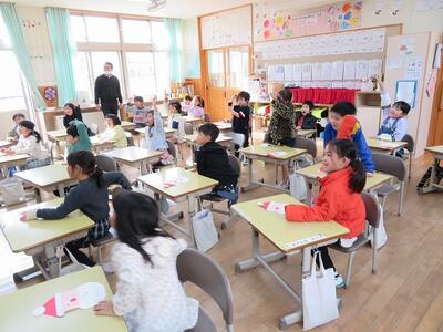 1年生は国語、はがきの書き方を勉強していました。仕上げは本物のはがきに書き、決めた人に出すようです。