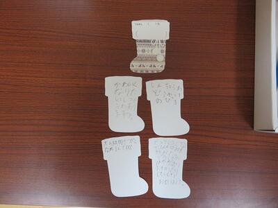 2時間目、1年生の外国語活動はクリスマスにちなんだ活動でした。サンタさんを作ったりゲームをしたりしました。指導される先生方もいろいろなクリスマスグッズで雰囲気を盛り上げていただき、1年生も大喜びでした。