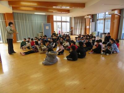 昨日、持久走大会後に学級懇談会が行われている時、子どもたちには、本に親しむための活動を行いました。1・2・3年生は、多目的ホールで職員の読み聞かせと読書の楽しさを伝えるゲーム、アニマシオン「前かな、後ろかな?」「ダウトをさがせ」をしました。
