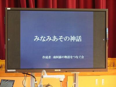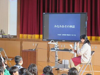 4・5・6年生は、体育館でループ南阿蘇の職員さんによる読み聞かせ「南阿蘇村の神話」とタブレット図書館利用のお話を聞きました。